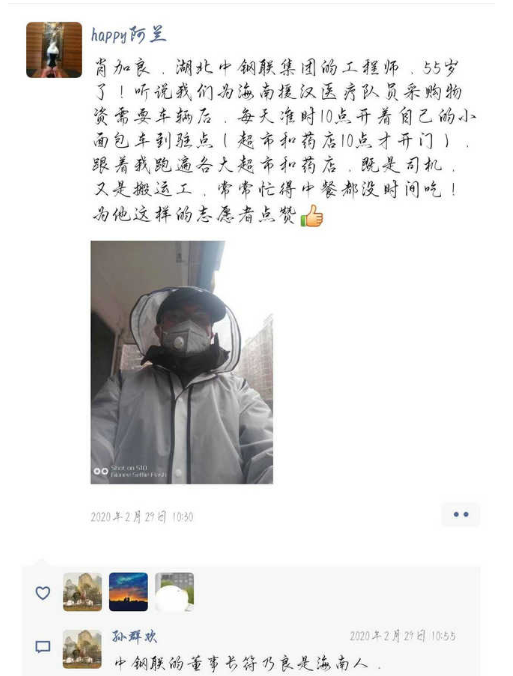 肖加良,湖北中鋼聯(lián)機械制造廠廠長,在公司算比較年長,已經(jīng)55歲了,聽說區(qū)工商聯(lián)組織人員保障海南省援漢醫(yī)療隊,保障隊缺司機和車輛,他二話不說就帶車加入保障隊伍,從2月5日開始一直到上周,每天開著自己的面包車輾轉(zhuǎn)各大超市、藥店和醫(yī)療隊駐地,既當司機又當搬運工,有時候忙的飯都顧不上吃,還要時刻做好防護和消毒工作,我們要為他的行為點贊。